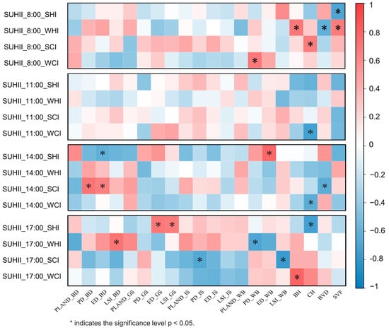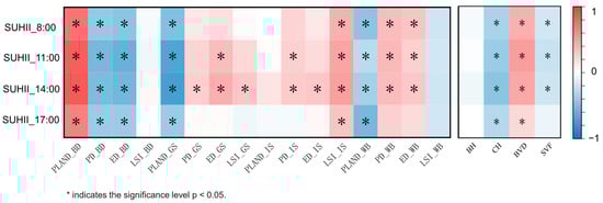 In this study, the Pearson correlation analysis is adopted to identify campus landscape indicators that are significantly correlated with multi-temporal SUHII. Figure 10 illustrates the substantial correlation between SUHII and two-dimensional indices, including PLAND_BD, PD_BD, ED_BD, PLAND_GS, LSI_IS, and PLAND_WB. Among them, PLAND_BD and LSI_IS are positively correlated with SUHII, with correlation indexes of 0.846 and 0.490. However, SUHII had a negative association with PD_BD, ED_BD, PLAND_GS, and PLAND_WB, with correlation indices of −0.507, −0.549, −0.733, and −0.354, respectively. Conversely, there is a weak link between SUHII and the 3D indices represented by CH, BVD, and SVF, with correlation values of −0.450, 0.451, and −0.185, respectively. During the day, the correlation degree between campus landscape configuration and SUHII reached the highest level at 14:00, which is higher than other periods. Notably, the 2D indexes for campus greenspace and impervious surface landscape layout, such as PD_GS, ED_GS, LSI_GS, PD_IS, and ED_IS, showed correlation with SUHII at 14:00, but not at other periods.