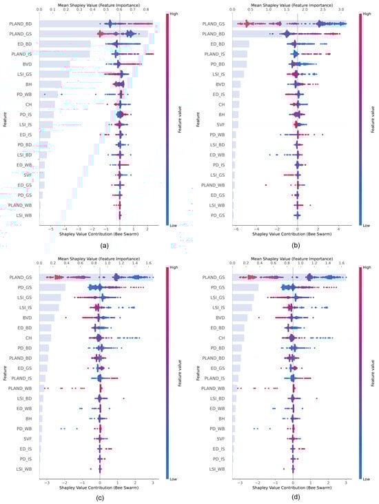 Finally, SHAP is applied to quantify the marginal contribution of each feature to the predicted value across all feature combinations, offering a globally interpretable framework. The Shapley value is a method from coalitional game theory [43] and the Shapley value represents the contribution of an individual feature by averaging its impact over all possible subsets of features. This method is frequently used to interpret machine learning outputs and assess the relative importance of predictors in relation to the target variable [44,45]. In this study, we use the SHAP summary_plot and Feature Importance to illustrate the global importance of campus landscape indices, thereby interpreting the factors that influence the intensity of the campus surface heat island. The calculation equation is as follows: