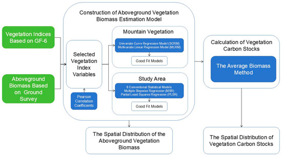 Using the foundational dataset created by pairing biomass measurements with the selected remote sensing factors, relevant statistical analyses were conducted in SPSS (version 27.0) software. These included establishing univariate curve regression models (SCRM), using the selected vegetation indices individually, as well as multivariate linear regression models (MLRM) employing combinations of the four spectral band reflectances and the selected vegetation indices. The best fitting model was selected based on the determination coefficient (R2) and the root mean square error (RMSE). Eight conventional statistical models, a multiple stepwise regression (MSR), and a partial least squares regression (PLSR) were chosen to construct the aboveground biomass estimation model for the study area. A PLSR model integrates the advantages of multiple linear regression, principal component analysis, and canonical correlation analysis, which can avoid potential issues such as a non-normal distribution of the data, uncertainty in the factor structure, and model non-identifiability.