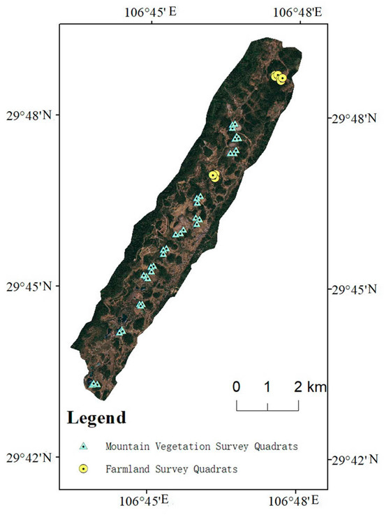 In early to mid-August 2021, a 10-day ground survey was conducted in the Tongluo Mountain area (Shichuan Town section) of Yubei District, covering a total of 15 plots, with GPS used for precise positioning at the center of each plot. This included 3 agricultural crop plots and 12 mountain vegetation plots, with the vegetation quadrats surveyed centered around each plot. Specifically, there were 16 tree quadrats dominated by Broussonetia papyrifera (paper mulberry) and Ficus virens (fig tree) (20 m × 20 m), 10 shrub quadrats dominated by Pyracantha fortuneana (firethorn) and Loropetalum chinense (Chinese witch hazel) (10 m × 10 m), and 10 herbaceous quadrats dominated by Artemisia (wormwood) and Solanum nigrum (black nightshade) (2 m × 2 m), as well as 9 agricultural crop quadrats representing Glycine max (soybean) and Zea mays (corn) (10 m × 10 m), totaling 45 vegetation quadrats. Of these, 75% of the samples (33 quadrats) were randomly selected for model establishment, and 25% (12 quadrats) were used for validation (Figure 3). The vegetation survey included detailed measurements and records of the height, north–south crown width, and base diameter of each standard plant and growth parameters such as the species frequency and plot coverage. The on-site sampling of the aboveground parts of standard plants of various vegetation types was conducted, and the aboveground biomass within the entire quadrat was calculated based on the dry and fresh weight of the survey samples. During the field survey, precise positioning was performed for each sampling point to obtain the latitude and longitude information of the sampling points.