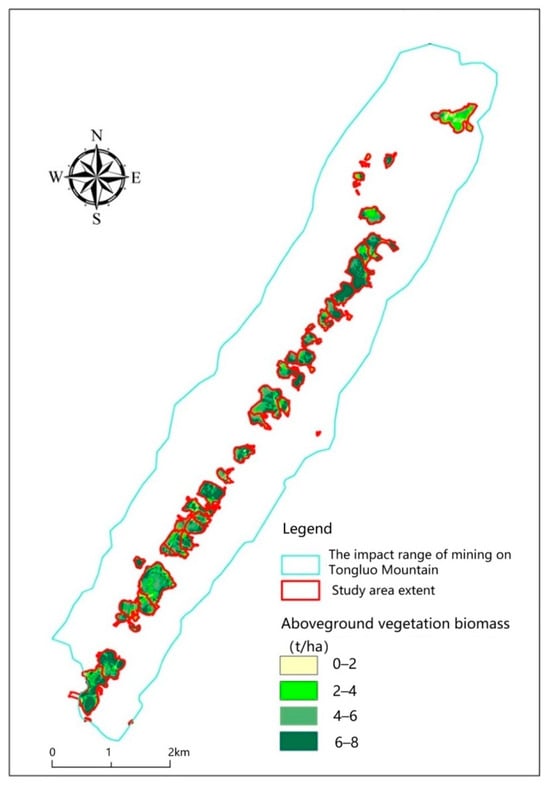 The biomass of forest communities is the most direct manifestation of the quality and functionality of the forest ecosystem structure, and it is a comprehensive reflection of the environmental quality of forest ecosystems. The quantitative estimation of a forest’s biomass provides an important reference for global carbon storage and carbon cycle research. The biomass data for each mine were exported for analysis, as shown in Table 5.