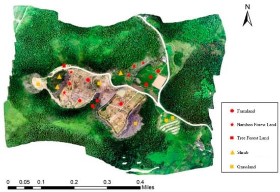 Based on the literature review and field investigation, the types and areas of land uses after the restoration of the study area are shown in the following table (Table 6), including dry land, arbor forest land, bamboo forest land, shrub land, grassland, and other areas. These areas had high ecological carbon sink benefits and were key areas in the carbon sink accounting, with survey plots set up for each type of land use according to the above formula. At the same time, the land also included paddy fields, agricultural land facilities, bare land, and other areas. Since the land functions of these areas were mainly for production, the ecological benefits were small and did not meet the requirements for carbon sink afforestation, so they were not considered in the accounting and no survey plots were set up.
