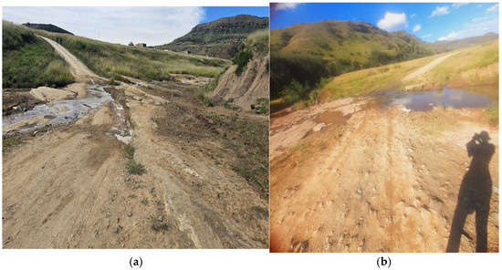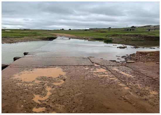 The results from the survey on the impact of extreme weather events like flooding and heavy rainfall on agricultural resources and infrastructure indicate a significant vulnerability of key farming assets to extreme weather events. The results show that bridges are among the most severely affected agricultural infrastructure components in the study area, with 85% of respondents indicating that bridges were highly affected by climate change-related impacts. In contrast, only 10% reported that bridges were moderately affected, and a mere 5% considered them to be less affected. The study has revealed that the study area is dominated by gravel roads with low-lying bridges (Figure 3), and in most instances without bridges, rendering the area to be highly vulnerable to flooding during heavy rainfall (Figure 4a,b). This situation disrupts access to essential farming services, collapsing food systems. Arable land was reported to be heavily affected, with 81% of respondents indicating that it was highly affected by flooding. This suggests that flooding severely damages crops, erodes soil, and reduces the productivity of farmland, making it highly susceptible to the adverse effects of extreme weather. A smaller portion of respondents (12%) reported moderate effects, and only 7% indicated that their arable land was less affected, highlighting the widespread damage flooding causes to farmland.