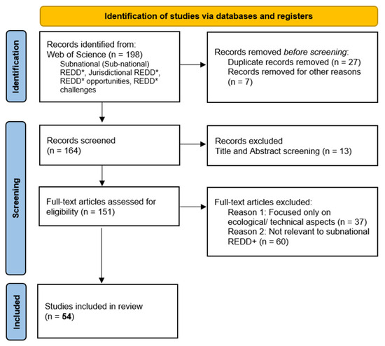 The search yielded a total of 198 articles. Following the PRISMA 2020 guidelines for literature selection, a two-stage screening process was conducted by two independent reviewers. In the first stage, the reviewers screened the abstracts to identify studies that aligned with the research objectives. In the second stage, the reviewers conducted a full-text review of the potentially eligible studies, of which 54 were selected as relevant to the study’s objectives. The selected literature comprised peer-reviewed academic articles and reports that addressed REDD+ implementation at the subnational or jurisdictional level. Our review focused primarily on English-language publications, as some relevant literature in other languages from non-Anglophone REDD+ implementing countries may not be represented.
