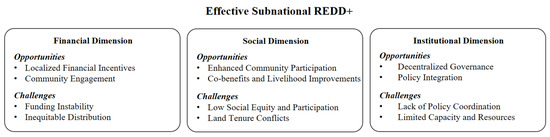 This study synthesizes the existing literature on subnational REDD+ implementation by identifying key opportunities and challenges across financial, social, and institutional dimensions. A systematic review reveals that these three dimensions are deeply interconnected and significantly influence the effectiveness, efficiency, and equity of REDD+ implementation. The conceptual framework presented emphasizes that challenges in one dimension can hinder progress in others, whereas strategic interventions have the potential to create positive cascading effects across multiple dimensions.