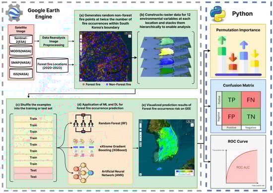 In this study, to exploit the growing availability of satellite data and proven benefits of ML, we integrated these tools for forest fire risk assessment. GEE provides an ideal environment for compiling and processing a suite of satellite-derived environmental variables (e.g., vegetation indices, land cover, elevation, and temperature anomalies) for model input. Therefore, we leveraged the GEE platform to evaluate forest fire vulnerability in South Korea using exclusively GEE-derived variables as predictors, in contrast to previous research that relies on ground measurements and expert-derived indices. Moreover, we compared the performance of three state-of-the-art ML models, including an ensemble tree model (random forest), a gradient boosting model (extreme gradient boosting; XGBoost), and an ANN, to determine the most effective approach for predicting forest fire risks in South Korea. This study provides support for developing an accurate and scalable forest fire prediction framework to promote forest management and disaster mitigation efforts in South Korea and beyond.