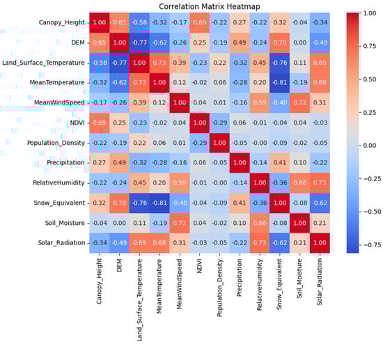 The Pearson correlation coefficients calculated for 5000 randomly sampled points across South Korea revealed several instances of strong linear dependence among the chosen predictors (Figure 3). A conservative threshold of |r| = 0.8 was adopted to guide the removal of highly collinear features. The most notable redundancy was observed for Snow_Equivalent, which showed a strong negative correlation with mean temperature (r = −0.81), exceeding the cutoff for exclusion. Although certain other pairs, most notably DEM and Land_Surface_Temperature (r = −0.76), also exhibited relatively high correlations, none surpassed ±0.8. After the removal of Snow_Equivalent, the remaining variables displayed only moderate or weak associations, thereby reducing the risk of multi-collinearity and providing a more stable basis for subsequent fire occurrence modeling.