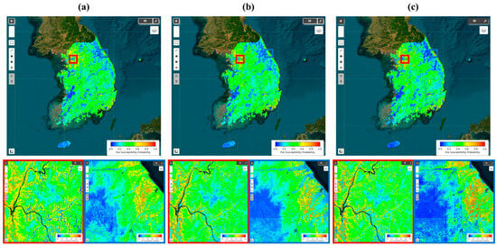 All three models—random forest, XGBoost, and ANN—predicted broadly consistent patterns of fire risk across South Korea, with each highlighting largely similar regions with heightened risk (Figure 4). However, notable differences arose in the magnitudes of the predicted risk at finer spatial scales. In particular, the random forest model tended to yield the highest overall estimated probabilities, whereas ANN produced comparatively lower values. The XGBoost outputs typically fell between these two extremes, suggesting a more intermediate assessment of fire risk. Despite these local-scale variations, the three approaches agreed on the most vulnerable areas nationwide, reflecting shared identification of the core drivers of fire risk, despite each algorithm applying its own distinct strategy for handling non-linearities and variable interactions.
