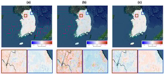 Prediction bias maps showing differences in predicted fire probability values from the mean probability values for each machine learning model: (a) random forest; (b) XGBoost; (c) ANN. Insets present higher-spatial-resolution maps for two locations in the study area.