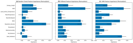 To quantify the relative influence of each variable on fire occurrence, a permutation-based feature importance evaluation was conducted for the three ML models. This method examines the extent to which the predictive accuracy of a model declines when the values of a specific variable are randomly permuted, indicating the importance of that variable (Figure 6).