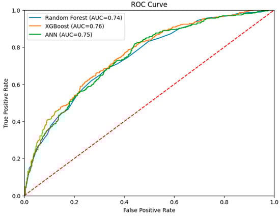 As well as confusion matrices and F1 scores, we further evaluated the performance of each model by examining the ROC curves and their corresponding AUC values (Figure 8). The ROC curve plots the true-positive rate against the false-positive rate across all possible classification thresholds, with the diagonal red line representing the random chance performance (AUC = 0.5). As shown in Figure 7, XGBoost achieved the highest AUC (0.76), indicating a marginally better overall ability to discriminate between fire and non-fire cases than the other two models. The ANN and random forest models followed closely with AUC values of 0.75 and 0.74, respectively. These AUC values aligned closely with the trends observed in the confusion matrices. Although all three models exhibited relatively similar performance, XGBoost consistently handled the trade-off between true and false positives slightly more effectively.