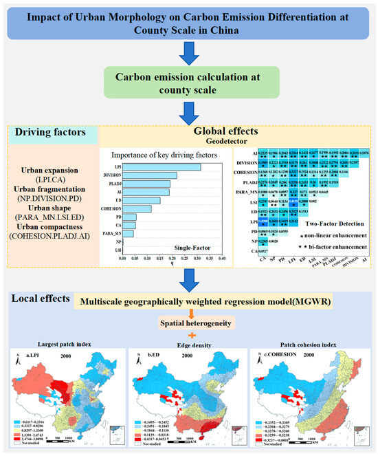 Building on this foundation, this study focuses on county-level units in China. First, it calculates CE for Chinese counties by integrating energy consumption and nighttime light data. Next, it quantifies urban morphology using landscape metrics from four dimensions: urban expansion, fragmentation, shape, and compactness. Finally, it employs geographic detectors and the MGWR model to comprehensively analyze the global and local characteristics of the impact of county-level urban morphology on CE in China from 2000 to 2020 (Figure 1). Based on these findings, this study proposes recommendations for carbon emission reduction through the spatial optimization of urban morphology at the county level in China.