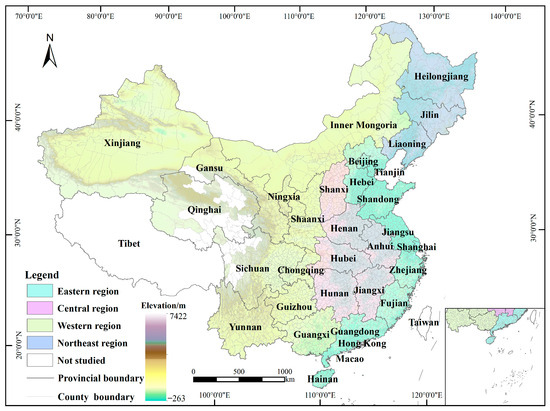 This study focuses on China as the research area. The research region does not include Tibet, Taiwan, Hong Kong, or Macau due to the availability of data. The study thus encompasses 30 provinces, including four autonomous areas and four municipalities under direct government. The National Bureau of Statistics of China’s regional division technique divides these 30 provinces into four regions: central, western, northeastern, and eastern China (Figure 2).