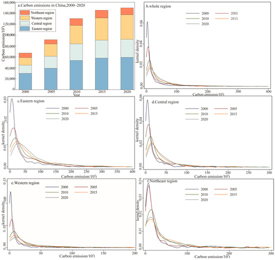 Regionally (Figure 3a), the eastern region is the primary contributor to China’s CE, followed by the central, western, and northeastern regions. This phenomenon is mainly due to the eastern region being the economic frontier of China, where rapid economic growth requires a large amount of energy consumption, resulting in a substantial concentration of people and the ongoing growth of populated regions, which in turn causes significant CE. However, CE in the central, western, and northeastern regions has been gradually rising, as has their share of total CE, as a result of the implementation of policies like the revitalization of the northeastern region, the rise of the central region, and the western development strategy. Over the study period, the kernel density curves for the eastern, central, and western regions generally aligned with the kernel density curve of county-scale CE across China. In general, the peaks of the kernel density curves in these regions continuously decreased over the 20-year period, indicating an increasing disparity in CE among county-scale units within these regions. Moreover, throughout the research period, the kernel density curve consistently displayed a single peak, reflecting a polarized state of county-scale CE within the regions. The general distribution in the northeastern area was relatively stable in comparison to the national trend, while the kernel density curve’s peak steadily decreased between 2000 and 2015. However, by 2020, the peak had risen slightly compared to 2015, suggesting a reduction in the disparity of CE among counties in the northeastern region. Furthermore, the northeastern region’s kernel density curve went to the right from 2000 to 2010 but moved left from 2015 to 2020, indicating that after a period of carbon emission growth, the region experienced a decline in emissions. This may be due to the more significant impact of environmental protection policies in the northeastern region.