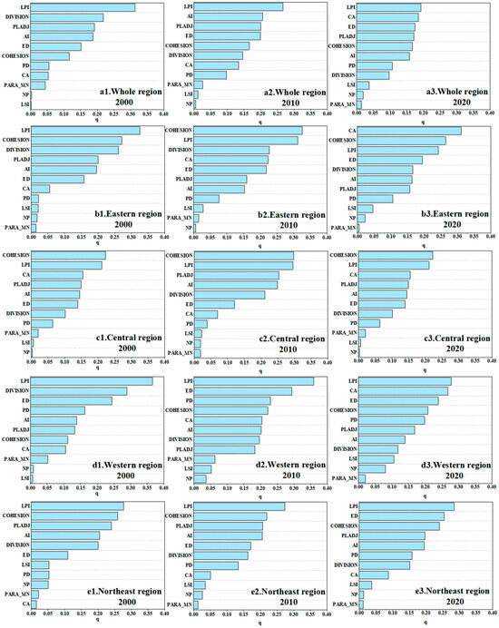 According to the degree of each factor’s effect throughout various time periods, the factors’ relative influence in the national context is as follows: In 2000, the strength of factors was ranked as LPI > DIVISION > PLADJ > AI > ED > COHESION > PD > CA > PARA_MN > NP > LSI. In 2010, the ranking was LPI > AI > PLADJ > ED > COHESION > DIVISION > CA > PD > PARA_MN > LSI > NP. In 2020, the ranking was LPI > CA > ED > PLADJ > COHESION > AI > PD > DIVISION > LSI > NP > PARA_MN. The average influence strength across all periods was LPI > PLADJ > AI > ED > DIVISION > COHESION > CA > PD > PARA_MN > LSI > NP. LPI consistently emerged as the strongest factor, while the influence of CA showed significant growth, moving from eighth position in 2000 to second position in 2020, reflecting the prominent impact of urban expansion on CE. In the northeast region, the factor strengths for 2000 were ranked as LPI > COHESION > PLADJ > AI > DIVISION > ED > LSI > PD > NP > PARA_MN > CA. In 2010, the ranking was LPI > COHESION > PLADJ > AI > ED > DIVISION > PD > CA > LSI > NP > PARA_MN. By 2020, the ranking shifted to LPI > ED > COHESION > PLADJ > AI > PD > DIVISION > CA > LSI > NP > PARA_MN. The average strength over all periods was LPI > COHESION > PLADJ > AI > ED > DIVISION > PD > CA > LSI > NP > PARA_MN. LPI remained the strongest factor, consistent with the national trend, while COHESION was the second strongest factor, and CA’s influence continued to grow. In the eastern region, the factor strengths for 2000 were ranked as LPI > COHESION > DIVISION > PLADJ > AI > ED > CA > PD > LSI > NP > PARA_MN. In 2010, the ranking was COHESION > LPI > DIVISION > CA > ED > PLADJ > AI > PD > LSI > PARA_MN > NP. By 2020, the ranking shifted to CA > COHESION > LPI > ED > DIVISION > AI > PLADJ > PD > LSI > NP > PARA_MN. The average strength for all periods was LPI > COHESION > DIVISION > CA > ED > PLADJ > AI > PD > LSI > NP > PARA_MN. CA showed the most significant growth in influence, moving from seventh position in 2000 to first position in 2020, indicating the substantial impact of urban expansion on CE in the eastern region. Within the central area, the factor strengths for 2000 were ranked as COHESION > LPI > DIVISION > AI > PLADJ > ED > CA > PD > LSI > NP > PARA_MN. In 2010, the ranking was COHESION > LPI > PLADJ > AI > DIVISION > ED > CA > PD > LSI > NP > PARA_MN. By 2020, the ranking shifted to COHESION > LPI > CA > PLADJ > AI > ED > DIVISION > PD > LSI > PARA_MN > NP. The average strength over all periods was COHESION > LPI > PLADJ > AI > DIVISION > ED > CA > PD > LSI > PARA_MN > NP. COHESION remained the strongest factor throughout, indicating its dominant role in the region. In the western region, the factor strengths for 2000 were ranked as LPI > DIVISION > ED > PD > AI > PLADJ > COHESION > CA > PARA_MN > NP > LSI. In 2010, the ranking was LPI > ED > PD > COHESION > CA > AI > DIVISION > PLADJ > PARA_MN > LSI > NP. By 2020, the ranking shifted to LPI > CA > ED > COHESION > PD > PLADJ > AI > DIVISION > LSI > NP > PARA_MN. The average strength over all periods was LPI > ED > DIVISION > PD > CA > COHESION > PLADJ > AI > LSI > PARA_MN > NP. LPI remained the strongest factor, while CA’s influence continued to grow, reflecting the increased impact of urbanization in the western region.