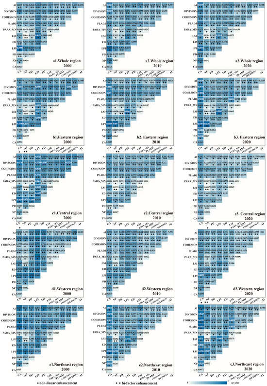 Over the study period, the occurrence of dual-factor enhancement types increased steadily (Figure 5(d1–d3)). The northeast region also showed nonlinear enhancement throughout the study period, with relatively stable changes (Figure 5(e1–e3)). At the national county scale, the interaction effects were mainly dual-factor enhancement, with relatively stable overall changes (Figure 5(a1–a3)). The impact of each urban morphology factor on CE was assessed through the intensity of interactions among the influencing factors. During the study period, in the eastern region (Figure 5(b1–b3)), the interaction strength of LPI, COHESION, and CA with other factors was significantly higher than that of other factors, identifying them as the primary drivers of CE in this region. In the central region (Figure 5(c1–c3)), LPI and COHESION demonstrated stronger interaction effects with other factors, indicating their dominant role in influencing CE. In the northwest (Figure 5(d1–d3)) and northeast regions (Figure 5(e1–e3)), LPI emerged as the primary influencing factor. At the scale of the entire study area (Figure 5(a1–a3)), LPI was consistently identified as the key factor driving CE. Overall (Figure 5), we observed that the interaction between LPI and CA was the strongest, clearly higher than the interaction strength between other influencing factors.