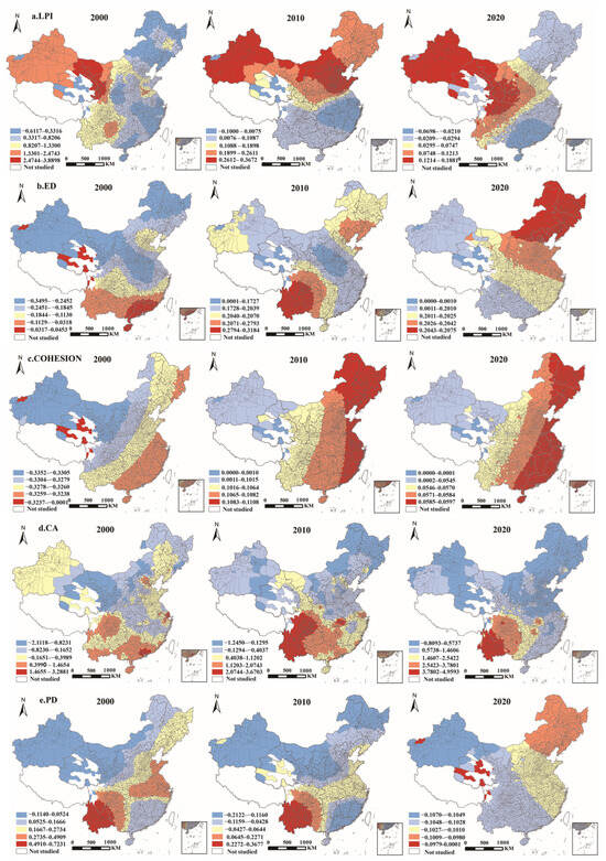 To further examine the spatial impact scale and heterogeneity of various driving factors on urban energy consumption CE in China, the MGWR model was applied for regression analysis of each variable’s coefficients. The results were visualized using ArcGIS10.7 to reveal spatial distribution characteristics (Figure 6). Findings indicate that LPI (Figure 6a) generally exerted a positive effect on CE across Chinese counties, with this effect diminishing between 2000 and 2020. This change may be closely related to the transformation of urban development models during urbanization, as many cities have shifted from a single-core to a multi-center development model. This shift helps to decentralize urban functions, reduce pressure on single-core areas, and decrease the concentration of CE. Spatially, the positive effect of LPI decreased from west to east, with counties in western regions like Xinjiang, Gansu, and Inner Mongolia showing the most significant positive impact of LPI on CE, while counties in the middle and lower reaches of the Yangtze River had relatively weaker effects. This could be a result of the western provinces’ more trailing urbanization and economic growth model as well as the slower pace of the shift from a single-core to a multi-center development model. In contrast, eastern regions had higher urbanization levels and larger city sizes, making it easier to achieve the shift from a single-core to a multi-center development model. ED (Figure 6b) showed a negative effect on CE in Chinese counties in 2000, but this changed to a positive effect in 2010 and 2020. This change may be related to urban expansion patterns. In the early stages, cities may have rapidly spread outward in a “sprawling” pattern, merging fragmented suburban construction land patches. This process reduced urban fragmentation, thereby decreasing CE to some extent. However, over time, this disorderly expansion pattern led to increased resource consumption, which in turn drove an increase in CE. COHESION (Figure 6c) showed a negative effect on CE in Chinese counties in 2000, but this shifted to a positive effect in 2010 and 2020. CA (Figure 6d) generally had a positive effect on county-scale CE, and its positive effect increased over the study period. PD (Figure 6e) had both positive and negative effects on CE in 2000 and 2010, with the absolute value of the coefficient in 2010 smaller than that in 2000. In terms of spatial distribution, areas with high positive effects were mainly concentrated in Yunnan Province, while regions with negative effects were primarily found in counties in Xinjiang, Inner Mongolia, Guangdong, and Fujian. By 2020, PD had a negative effect across the entire region, with a relatively consistent distribution that aligned with the global effect of PD.