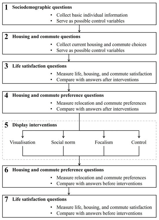 The authors conducted randomised controlled trials to test the effectiveness of different interventions. Participants in the experiments were recruited from Credamo, an online panel data platform in China. The questionnaire consists of seven sections (see Figure 2) covering four groups of information, i.e., background information, life and housing satisfaction, travel and housing preferences, and behavioural interventions.