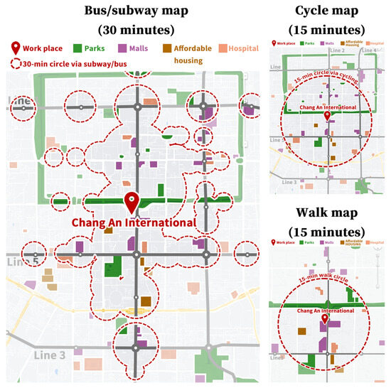 The questionnaire provided participants with three maps generated based on the location of their workplaces, which were recorded in their answers to questions in Block 2. An example of these maps is given in Figure 3. These maps show the surrounding bus/subway stations, shopping centers, affordable communities, parks, and hospitals. The purpose of these maps is to make participants aware of useful facilities around their workplaces. Previous studies [44] using similar interventions have shown that once participants become more familiar with the area, they may find living near their workplaces is a good choice, thereby changing their location choices and reducing commute time.