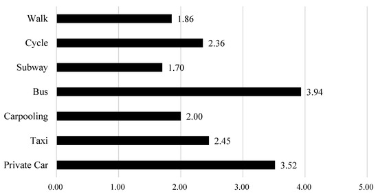 The authors chose Xi’an as the study area because the city has an extensive public transportation network and ground transportation does not suffer from severe congestion problems as in other major Chinese cities. It is important that respondents in these experiments are actually able to change their commuting modes should they decide to do so. Otherwise, it is not possible for their intention and actions to be aligned. As shown in Figure 4, the respondents have a good range of commute modes to choose from, and most use more than one method. Buses and private cars are the two most commonly used commuting modes. This finding supports the authors’ choice of study area for the experiments.
