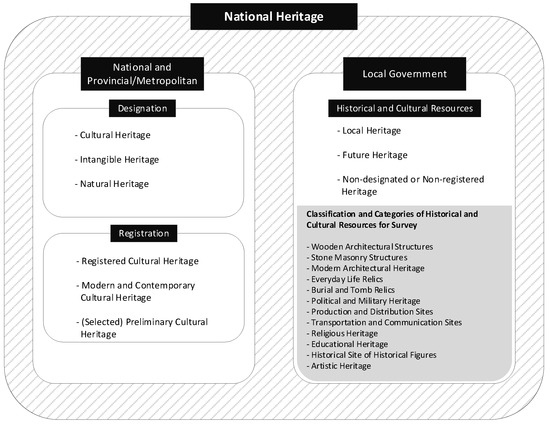 The Framework Act on National Heritage classifies national heritage into three categories: cultural heritage, natural heritage, and intangible heritage. It also provides comprehensive legal protection for non-designated or non-registered heritage assets, such as local heritage assets. In this study, the term historical and cultural resources refers to non-designated and non-registered heritage assets managed by local governments, including local and future heritage assets.