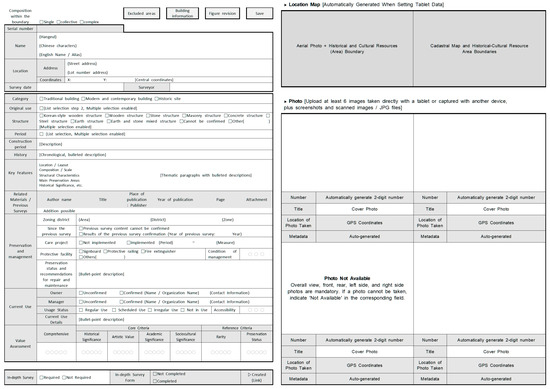 Once survey targets were selected, the lead investigator conducted training sessions for all participating researchers on field survey methods and value assessment criteria. The lead investigator also monitored the survey process to resolve potential issues and ensure accuracy. The national-level survey covered a wide range of data, encompassing spatial coordinates, names, addresses, surveyor identities, physical and managerial conditions, usage status, in-depth evaluation forms, and comprehensive value assessments, including historical, artistic, academic, social, rarity, preservation, and overall value categories (Figure 3).