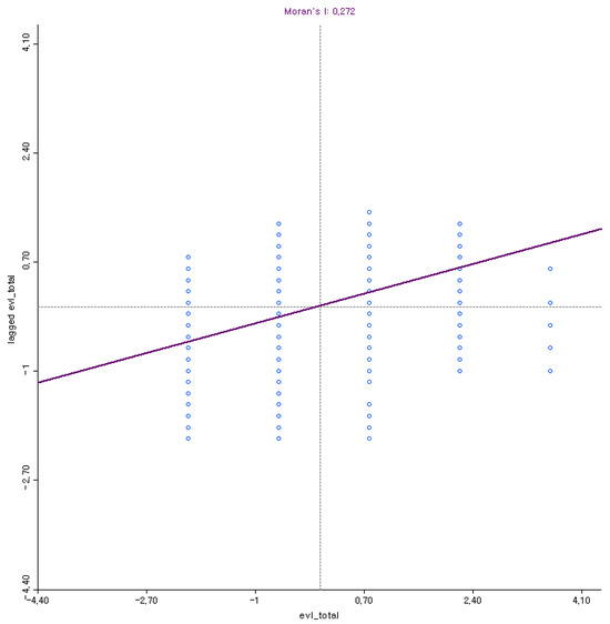 The calculated Moran’s I value is 0.272, indicating a weak-to-moderate positive spatial autocorrelation (Figure 7).