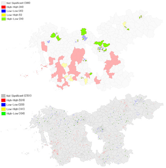 Following the global analysis, LISA was used to generate cluster maps based on both administrative units and point data. This enabled the identification of significant local clusters (e.g., high–high, low–low) from a localized spatial perspective (Figure 8).
