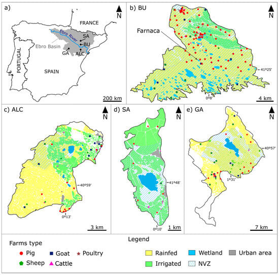(a) Location of the study areas in the Ebro Basin and the four wetlands watersheds: (b) Sástago-Bujaraloz (BU); (c) Alcañiz-Calanda (ALC); (d) Sariñena (SA); (e) Gallocanta (GA) showing the location of the wetlands, the intensive farms, the irrigated area, and the nitrates vulnerable zones (NVZs).