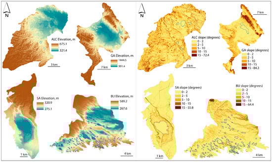 LiDAR-derived Digital Elevation Model of the studied basins (left) and their corresponding slope maps (right). Wetlands are delimited in blue.