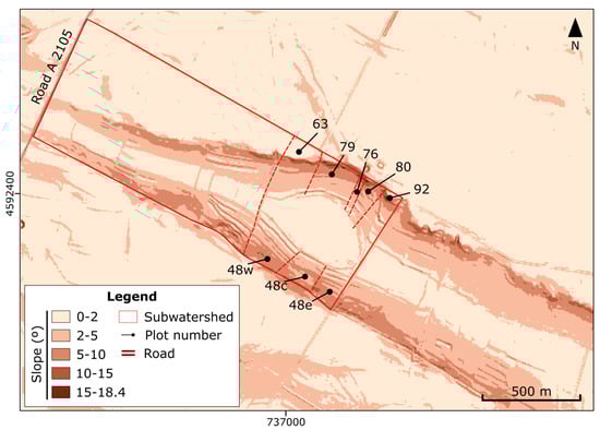 Slope map of the Farnaca watershed obtained from the available LiDAR-derived Digital Elevation Model (LiDAR-PNOA-cob2 2015 CC-BY 4.0 (scne.es)). The red perimeter shows the eight slope segments with the numbers indicated, and the subwatershed modelled with WEPP.