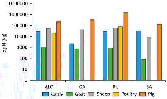We estimated the amount of nitrogen (N) produced from animal excreta (hereafter called ‘gross N’) considering the maximum capacity of the farms declared in the regional register of animal farms (https://www.aragon.es/-/explotaciones-ganaderas, (accessed on 27 May 2025)) and the amount of N excreted by pigs [] and other types of animals like bovine (18.07 kg N), chicken (0.12 kg N), goat (8.18 kg N), quail (0.03 kg N), sheep (5.49 kg N), and turkey (0.46 kg N) []. Due to the variability in the regional assessments of the amounts of N excreted by pigs, we used the minimum medium and maximum values reported by these sources (Table 2). N losses during manure storage and management were not considered due to the lack of data at this scale.