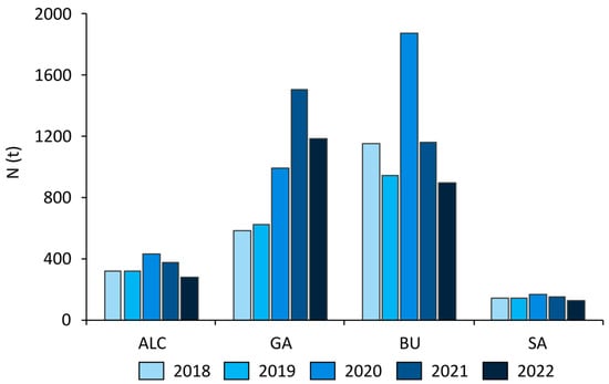 At the scale of the basin, Figure 6 shows the total N requirements for the period 2018–2022. The basins with the highest N needs to cover cereal requirement were BU and GA. The year showing minimum N requirements was 2022 for all the basins except for GA, which showed the minimum in 2018. The maximum N requirements occurred in 2020 in all basins except GA.