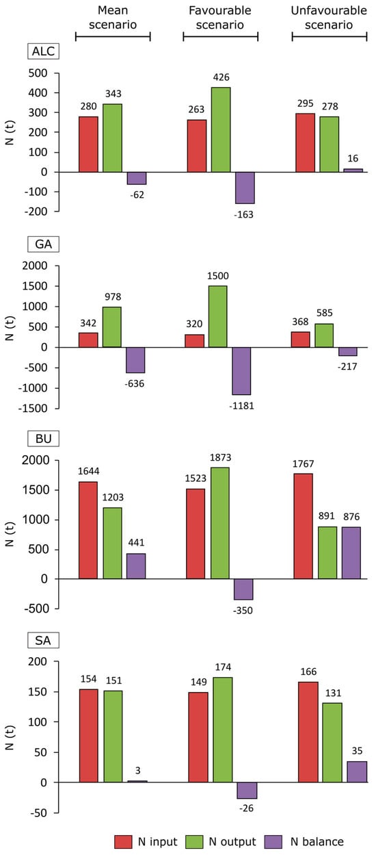 The analysis of N balances at different spatial scales provides useful information to assess the N load and its potential to pollute the studied wetlands. The basins studied present different situations of livestock pressure. The balance between inputs and outputs varies between the big excess in Sástago-Bujaraloz to the negative balance of Gallocanta in the mean scenario. The balance between inputs and outputs varies between the big excess in Sástago-Bujaraloz to the negative balance of Gallocanta in the mean scenario.