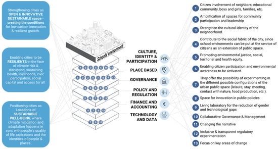 Adapting schoolyards and their surroundings to climate change offers a strategic window for rethinking and innovating urban management practices [4]. Traditionally conceived as functional spaces for children’s recreation and sports practice, these spaces have historically been managed under centralised technical logic, with little institutional flexibility and little participation of the educational community [26,27,28]. However, the climate emergency, the growing concern for children’s health, and the need to build more inclusive cities are revaluating these environments’ role in urban regeneration and social resilience [26,27,29].
