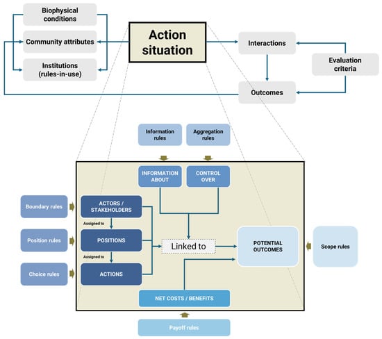 The core of the IAD framework is the ‘action situation’, conceived as the social space where different actors make decisions, negotiate, cooperate, or enter into conflict. This concept allows us to focus the analysis on the immediate structures that shape collective behaviours and the outcomes of an institutional process [21,22,23,24,25]. The IAD framework proposes we decompose these situations into their key elements to identify patterns, explain dynamics, and guide possible reforms in institutional arrangements.