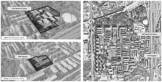 Within this context, the two public schools selected—Sagunto School and Navas de Tolosa School—served as test beds for exploring innovative approaches to the design of educational spaces that are not only greener and more climate-resilient, but also socially inclusive and better integrated into the neighbourhood’s urban and community dynamics. Their selection was especially pertinent given their strategic role as daily points of encounter for vulnerable children and families, their limited environmental quality, and their potential to catalyse broader processes of ecological regeneration and community empowerment at the neighbourhood scale.