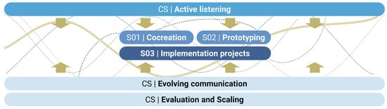 A multiphase methodological architecture was structured around the project to bridge technical development with civic engagement. It combined three cross stages (CSs)—active listening, evolutionary communication, and evaluation and scaling—with three iterative stages (Ss): co-creation, prototyping, and technical drafting of the implementation project (Figure 4). These stages articulated participatory urban experimentation with formal planning instruments, enabling institutional reflection, collective creativity, and situated learning. This architecture allowed for integrating pedagogical, political, and design perspectives into a cohesive process of urban transformation, positioning the schoolyards not merely as objects of design, but as platforms for testing new governance models and climate–social infrastructures [Appendix B: Methodological architecture of the urban experiment].