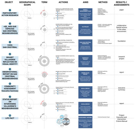 Figure 6. Mapping of existing projects, studies, and initiatives in the territory. - CS|Evolving communication: The second cross-cutting stage consisted of designing a communication strategy as a pedagogical, political, and cultural tool that did not limit itself to informing, but accompanied the process, critically documented it, and allowed for shared learning [69]. Audiovisual materials were produced (such as the video manifesto La Asamblea de la Infancia and the documentary In Praise of the Schoolyard), collective publications, graphic records of the workshops, and educational resources adapted to different ages and audiences [Appendix C: List of dissemination activities (videos)]. In addition, public events, school presentations, and technical forums were held, where progress was shared, impressions were gathered, and approaches were fine-tuned. This evolving communication legitimised the process, broadened its scope, and strengthened community ownership.