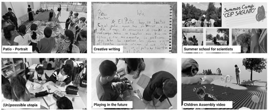 - S01|Co-creation: Co-creation stood at the heart of the process, serving as both a methodological and political device that fostered the participation of diverse actors to jointly generate value through equality, transparency, dialogue, and trust among participants [71,72]. According to Trischler [73], co-creation transforms the traditional supplier–customer relationship, turning the citizen into an end user and a designer. Through more than 24 sessions with students from both schools, creative writing, ecological imagination, and participatory design strategies were deployed. Dynamics included games, emotional mapping, commented tours, and dramatisation of desired futures. Exercises such as the ‘Patio Portrait’ or ‘Utopia is Possible’ allowed for construction of a collective narrative of the school space and its shortcomings and potential (Figure 7). Co-creation was also extended to teachers, families, social organisations in the neighbourhood, and municipal technicians, creating a multistakeholder and multidisciplinary meeting space.
