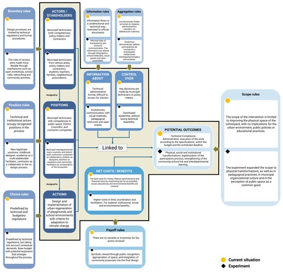 The results of applying the IAD framework to the case study are presented below. Figure 8 summarises the analysis of the action situation [23]. For this research, the traditional process is referred to as the ‘current situation’ and the collaborative planning as ‘the experiment’. The current situation refers to the traditional process of designing school environments, characterised by a hierarchical, expert-led approach with limited participation from the educational community and a focus on technical compliance. The experiment denotes collaboratively redesigning and renaturalising two schoolyards through active listening, co-creation, participatory prototyping, and collective monitoring, integrating children’s, teachers’, and community members’ knowledge and perspectives into public decision-making. The comparative analysis reconfigures the conditions that structure collective action and public decisions in the urban realm.