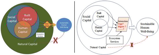 Ecosystem services serve as the critical bridge connecting UERS ecosystems with human well-being. Haines proposed the ecosystem services cascade framework [], which emphasizes ecosystem services as the foundation supporting human well-being, and recognizes human well-being as both the ultimate goal and core component of sustainability []. The cascade framework effectively elucidates the interactive stress effects between ecosystem services and well-being through its “impact chain”, successfully addressing the transmission process from ecosystem services to human well-being. However, this framework overlooks human agency []. In response to this limitation, Costanza introduced a capital co-production framework, which emphasizes that natural capital must be activated through its interactions with human, social, and built capital to produce sustainable well-being [,] (Figure 1, left). Liu also highlights that ecological services and human well-being are varied, multilayered, and scale-dependent, characterized by intricate interactions []. While Costanza et al. have demonstrated the necessity of interactions among four capital types (natural, human, social, and built) for well-being generation [], their framework contains a critical gap, which assumes that “capital interactions automatically produce well-being” without elucidating whether differentiated human–nature interactions (in both type and degree) might lead to well-being heterogeneity under equivalent capital combinations (Figure 1, right) [,].