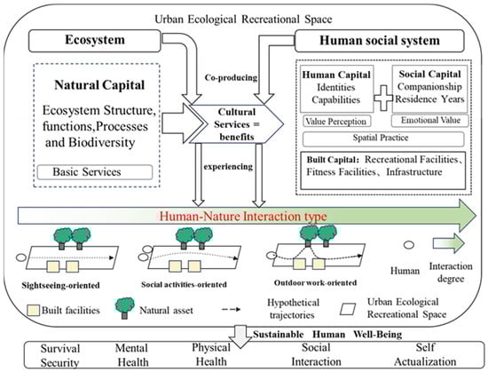 Building upon these frameworks, this study therefore integrates human–nature interaction typologies into the ”ecosystem services and human wellbeing” analytical framework as an additional dimension under given capital combinations. Specifically, we hypothesize that even under identical capital configurations (e.g., same green infrastructure and access conditions), different types of human–nature interactions, such as passive appreciation vs. active ecological engagement, will lead to qualitatively distinct well-being. We transcend the traditional supply-side focus in ecosystem services research, effectively upgrading Costanza’s static capital interaction framework into a dynamic “capital interaction–-behavior choice–well-being” model, which introduces agency and behavioral heterogeneity into the “Ecosystem services–well-being” pathway, thereby offering a more robust framework for analyzing how UERS function not merely as service providers, but also as interactional arenas where individual behavior shapes the translation of ecosystem potential into realized well-being. This extension enables a better understanding of spatial and individual variation in well-being, and provides a behavioral foundation for future planning and policy design in urban ecological systems.