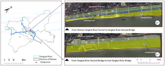 Moreover, Hankou waterfront may reflect broader patterns found in urban green and blue spaces. Although urban nature takes diverse forms, such as community gardens (promoting food security, social cohesion, and mental well-being) [], rooftop and vertical greenery (linked to climate regulation and aesthetic perception) [], and blue spaces (associated with psychological restoration and intergroup connection) [], these environments similarly facilitate human well-being through CES-driven pathways. Such similarities may inform broader frameworks for UERS planning and assessment across different urban contexts. While structural-functional similarities, cultural and regional contexts may shape how users perceive and value CES in UERS. Studies have shown that aesthetic and recreational preferences differ between cultural groups, for example, East Asian users often emphasize harmony and symbolic meaning, whereas Western users tend to value individualistic recreation and visual openness [,]. However, such cultural differences are more likely to influence the strength of preferences for specific functions or activity types within a given CES pathway, rather than altering the underlying mechanisms through which CES contribute to human well-being. Therefore, selecting Hankou waterfront as the research site demonstrates both representativeness and scientific validity (Figure 3).