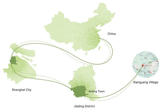 Xiangyang Village is located at the northwest gateway of Shanghai, adjacent to Huaqiao Town in Jiangsu Province. It is bordered to the east, west, and south by the Shanghai International Automobile City and Huaqiao International Business City, with Jiabei Country Park to the north (as shown in Figure 1). The village covers an area of 2.12 square kilometers and consists of 10 village groups, with 333 households and a registered population of 1350. In 2016, Xiangyang Village began its participation in the Construction of Beautiful Villages program. The village was included in the first batch of Shanghai Rural Revitalization Demonstration Villages in 2018 and has received the “Shanghai Civilized Village” title for five consecutive years.