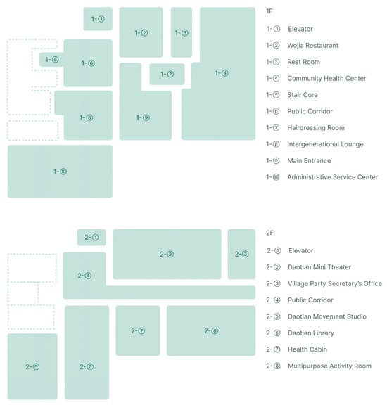 The first field survey was conducted on 4 February 2024. The first round of semi-structured interviews was conducted (see Table A1 for the interview guide). The interviewees included a deputy secretary of the village party branch (responsible for organization and publicity) and a permanent resident (approximately 80 years old). Detailed interview data are presented in Table A1. Additionally, the study incorporated spatial design proposals provided by the neighborhood center, along with on-site photographic documentation, to systematically document the spatial layout and interior configuration. These data serve as the basis for subsequent evaluation indicator calculations and spatial analysis.