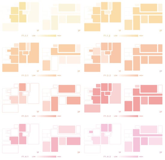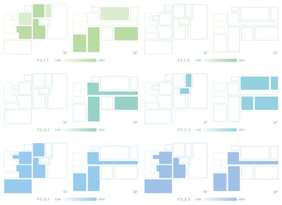 - Public–Private Relationship (F2.2). The functional aspect of public–private transition (F2.2.1) has an overall score of 0.295, indicating that the transition between public and private functions is poorly supported across most spaces. Among them, only Rooms 2-4, 2-6, and 2-8 fully support public–private conversion, with a score of 1.000. Similarly, the formal aspect of public–private transition (F2.2.2) exhibits an overall score of 0.355, reflecting that the interior design of most spaces does not effectively support the transition between public and private functions. Notably, Rooms 1-3, 1-7, 2-2, 2-3, 2-7, and 2-8 scored 1.000, indicating a higher degree of public–private adaptability in their interior design.