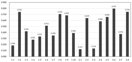 Based on the weights presented in Table 4, weighted average scores of the 14 indicators were calculated for each spatial unit, and the results are visualized in the form of a bar chart, as shown in Figure 7. Among all spaces, Room 2-6 achieved the highest average flexibility score (0.797), followed by Room 2-8 (0.743), Room 1-2 (0.742), and Room 1-8 (0.705). Conversely, Room 2-1 received the lowest evaluation (0.123), followed by Room 2-3 (0.134). Room 1-1 ranked third lowest, with a score of 0.184.