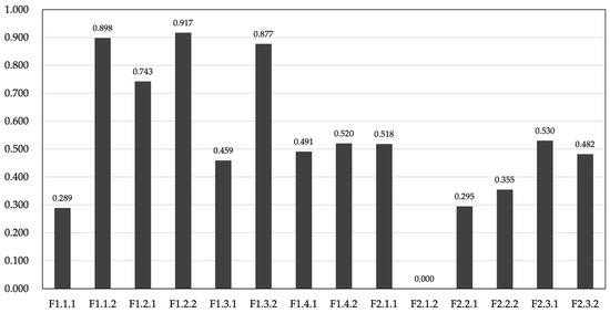 Finally, regarding overall spatial flexibility (as shown in Figure 8), F1.2.2 received the highest score of 0.917, followed by F1.1.2 (0.898), F1.3.1 (0.877), and F1.2.1 (0.743). The dimensions with the lowest scores include F2.1.2 (0.000), F1.1.1 (0.289), F2.2.1 (0.295), and F2.2.2 (0.355), all of which are below 0.4. Meanwhile, F1.3.1 (0.459), F2.3.2 (0.482), F1.4.1 (0.491), F2.1.1 (0.518), F1.4.2 (0.520), and F2.3.1 (0.530) demonstrate moderate performance, with scores ranging between 0.45 and 0.55.