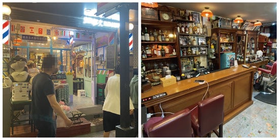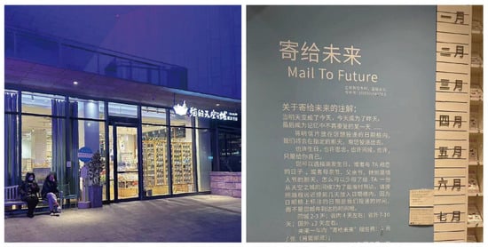 Figure 9. The Mail to Future corner in the Cat’s Sky City concept bookstore, Xuzhou City (photographed by the authors). In the left subfigure, the Chinese text above the entrance denotes the name of the bookstore, “Cat’s Sky City.” In the right subfigure, the vertical row of Chinese characters on the right indicates the months from January to July. The wall text on the left introduces the concept of “Mail to Future,” a participatory installation inviting users to write postcards scheduled for future delivery. Participants can select a delivery time and write to themselves or others. The text also provides details on estimated delivery times and pricing. - Flexible Transition between Public and Private Spaces. The current spatial configuration of the neighborhood center rigidly separates public and private spaces, with corresponding interior design elements reinforcing this division. However, in rural public cultural spaces, such an architectural approach of strictly delineating public and private spaces may not be suitable for highly flexible spatial demands. As previously discussed, rural public cultural spaces must not only cater to the diverse needs of rural stakeholders but also adapt to the dynamic evolution of rural industries. Drawing on Appleton’s prospect-refuge theory [41], which highlights the human preference for environments that balance openness (prospect) with shelter (refuge), we argue that flexible transitions between public and private spaces are essential for promoting spatial comfort, perceived safety, and behavioral adaptability. From a design perspective, adaptive public–private spatial strategies are recommended, including: (1) Flexible partitions that can be adjusted to modulate spatial openness or enclosure based on usage needs. For example, Raydoor, a New York-based interior partition company, emphasizes that “artful room division can help bring different areas of the space to life by facilitating both privacy and community” [42]. Their large-scale sliding wall systems are designed to blend seamlessly into the environment when retracted and to serve as both functional dividers and visual focal points when deployed (available online: https://vimeo.com/831702343, accessed on 22 May 2025). (2) Visual guidance techniques to subtly define spatial boundaries. For instance, the IBM workplace uses glass curtain walls in enclosed offices, meeting rooms, and collaborative zones to enhance spatial transparency and extend lines of sight, thereby improving user experience [43]. (3) Modular, movable furniture that enables rapid reconfiguration and repurposing of spaces. The Steelcase Flex Personal Spaces collection supports a broad range of spatial configurations and flexible transitions between work environments, with varying degrees of openness. This is achieved through two key elements—desks (offered in 90- and 120-degree configurations) and privacy wraps [44]. Furthermore, while structural retrofitting of the neighborhood center may be constrained due to its existing physical framework, digital service interventions can provide an alternative pathway for enhancing functional adaptability. Embedding modular digital service units into various spatial nodes can enable functional reconfiguration without altering the physical architecture, thereby mitigating structural rigidity and expanding spatial flexibility.